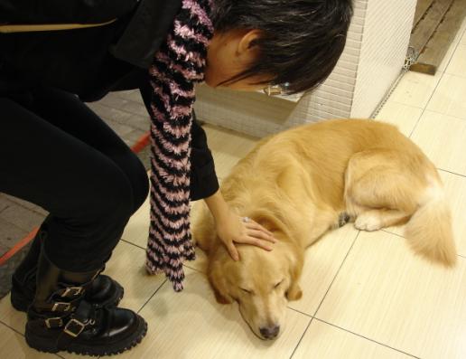 在一間飲料店門口招攬人氣的黃金獵犬!